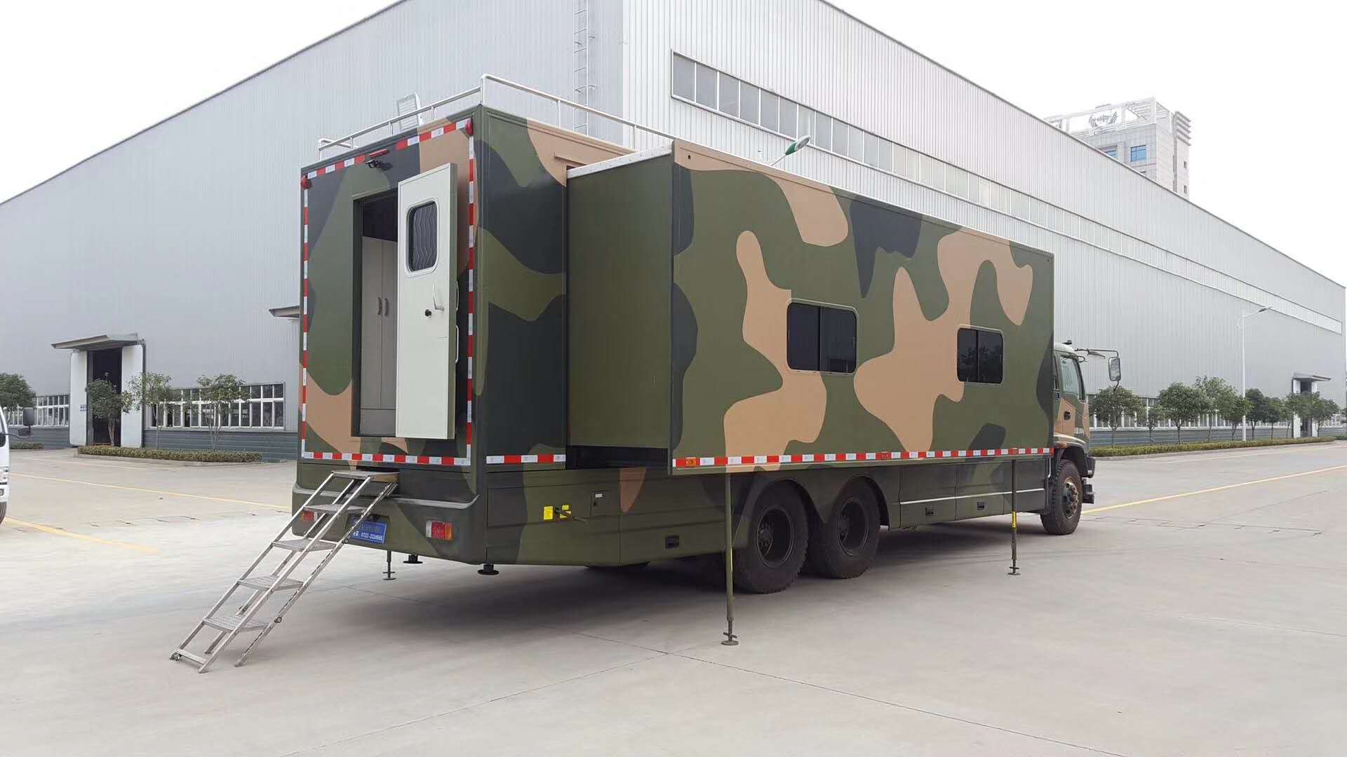 五十鈴底盤、箱體(鋼骨架、內、外蒙皮)擴展宿營方艙、宿營設施、上下床鋪、空氣調節系統、影視系統、電氣系統、安全系統整車配備衛生間、廚房柴油發電機、蓄電池、凈水箱、污水箱‘暖風機、兩臺空調外加輔助裝備等。